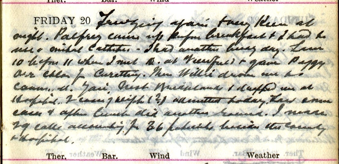 Freezing again + very keen at night. Palfrey1 came up before breakfast + I had to use a […] catheter2. I had another busy day. Saw 10 before 11 when I met D.3 at Viewfield + gave Peggy Orr4 Chlor[oform] for Curetting. Then Willie5 drove me to Cannon Street, Yair, Nest, Bridgelands + dropped me at Hospital. 2 cases of Diph. (?) 6 admitted today. Saw some cases + after lunch did another round. I made 29 calls accounting for 36 patients7 besides the County + Hospital.