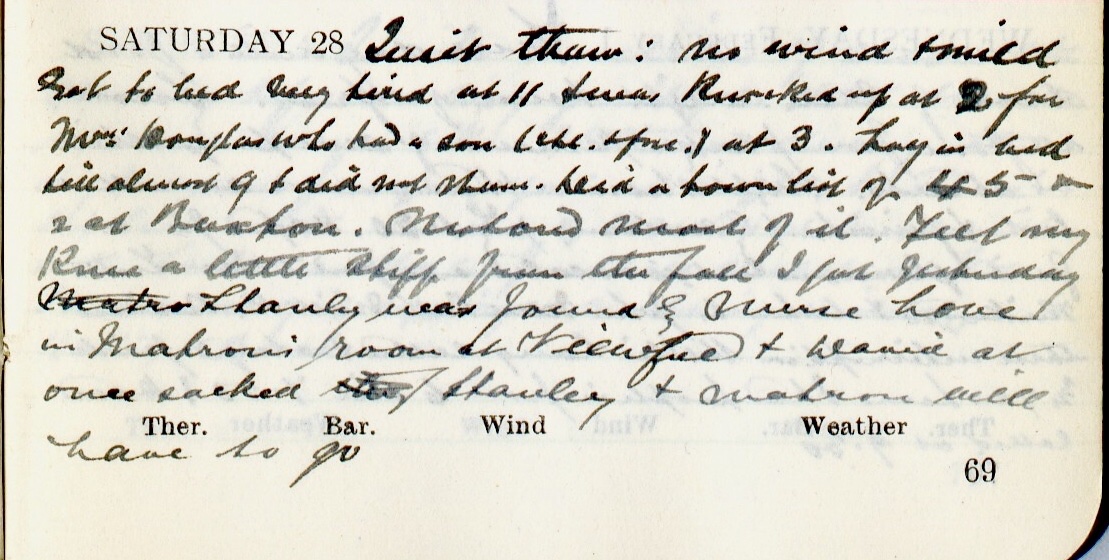 In spite of Dr Muir’s assertion Matron Waugh did not leave, at least not immediately, because she was recorded again in Dr Muir’s diary entries of 13 and 15 November 1922.