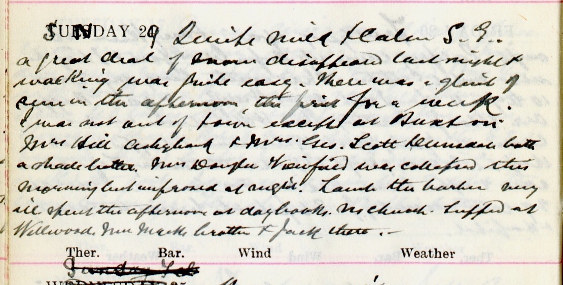 Quite mild + later S.E. A great deal of snow disappeared last night + walking was quite easy. There was a glint of sun in the afternoon, the first for a week. I was not out of town except at Buxton1. Mrs Hill, Ashybank2 + Mrs. Geo. Scott, Dunsdale3 both a shade better. Mrs Douglas4, Viewfield was collapsed this morning but improved at night. Lamb5 the barber very ill, spent the afternoon at day-books. No church. Supped at Wellwood6. Mrs Mack’s brother7 + Jack8 there.