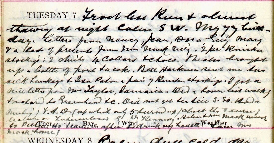 Frost less keen + almost thawing at night, calm S.W. [wind] My 77 birthday. Letters from Nancy1, Jean2, Dora3, Guy4, Mary5 + a lot of presents from Mrs Mack6 viz 2 pr. knicker stockings7: 2 shirts 4 collars8 + chocs. She also brought up a bottle of port + a cake. Bell Harkness9 sent me two silk hankeys [sic] + Isa Paton10 a pair of knicker stockings. I got a nice letter from Mrs Taylor, Jamaica11. Did a town list walking + motored to Greenhead +c. Did not get tea till 3.30. Had a meeting of V.A.D.12 (at which only 5 turned up) about the course of lectures on Tuberculosis by Kennedy13. Helen14 + Mrs Mack went to Picture Ho. + came in after to drink my health. Saw Mrs Mack home!15