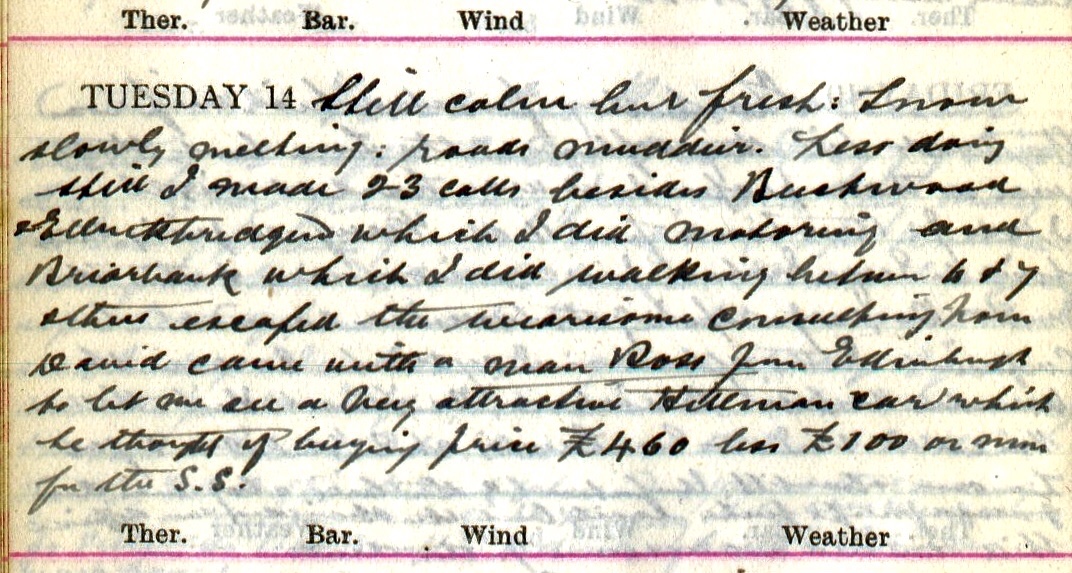 Still calm but fresh: snow slowly melting: roads muddier. Less doing. Still I made 23 calls besides Beechwood + Ettrickbridgend which I did motoring and Briarbank which did walking between 6 + 7 + thus escaped the wearisome consulting hour. David1 came with a man Ross from Edinburgh to let me see a very attractive Hillman2 car which he thought of buying price £460 less £100 or more for the S.S.3