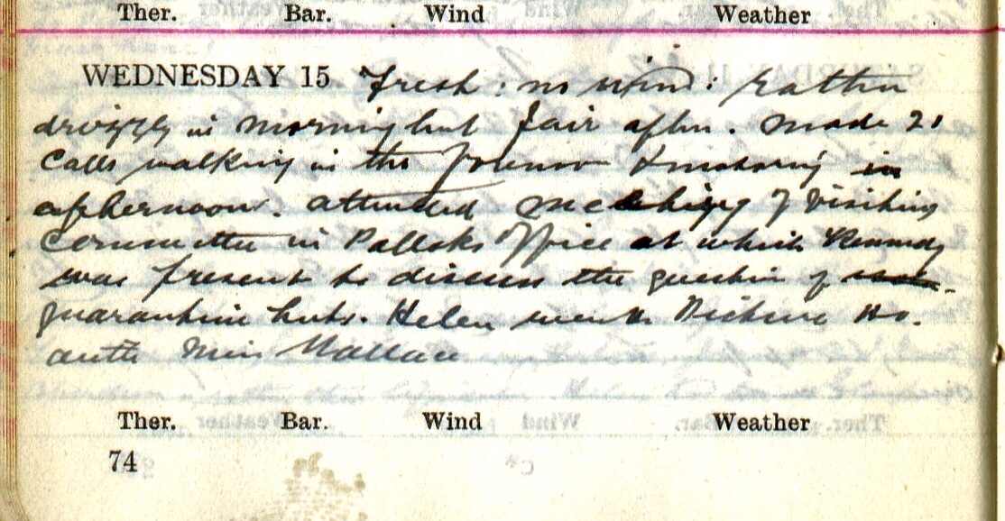 Fresh: no wind: rather drizzly in morning but fair after. Made 21 calls walking in the forenoon + motoring in afternoon. Attended [meeting ?] of Visiting Committee in Pollok’s offices1 at which Kennedy2 was present to discuss the question of [word deleted] quarantine huts3. Helen4 went to Picture House with Miss Wallace5.