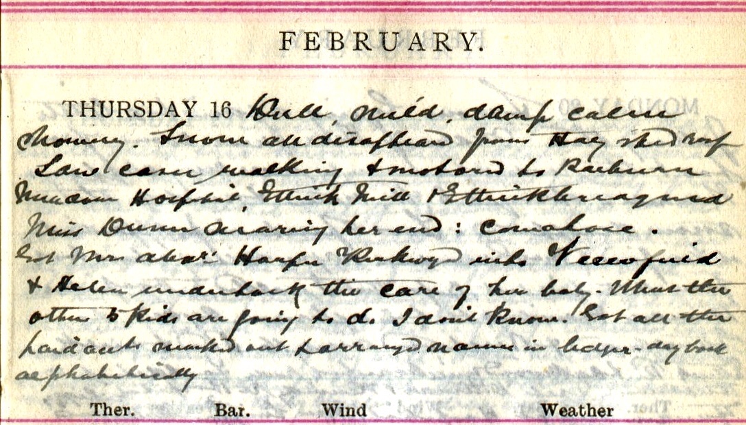 Dull, mild, damp, calm, showery. Snow all disappeared from Hay shed roof. Saw cases walking + motored to Raeburn Meadow, Hospital, Ettrick Mill + Ettrickbridgend. Miss Dunn nearing her end1: comatose. Got Mrs Alexander Harper2, Kirkwynd into Viewfield + Helen3 undertook the care of her baby. What the other kids are going to do I don’t know. Got all the the paid accounts worked out + arranged names in ledger – day book alphabetically.