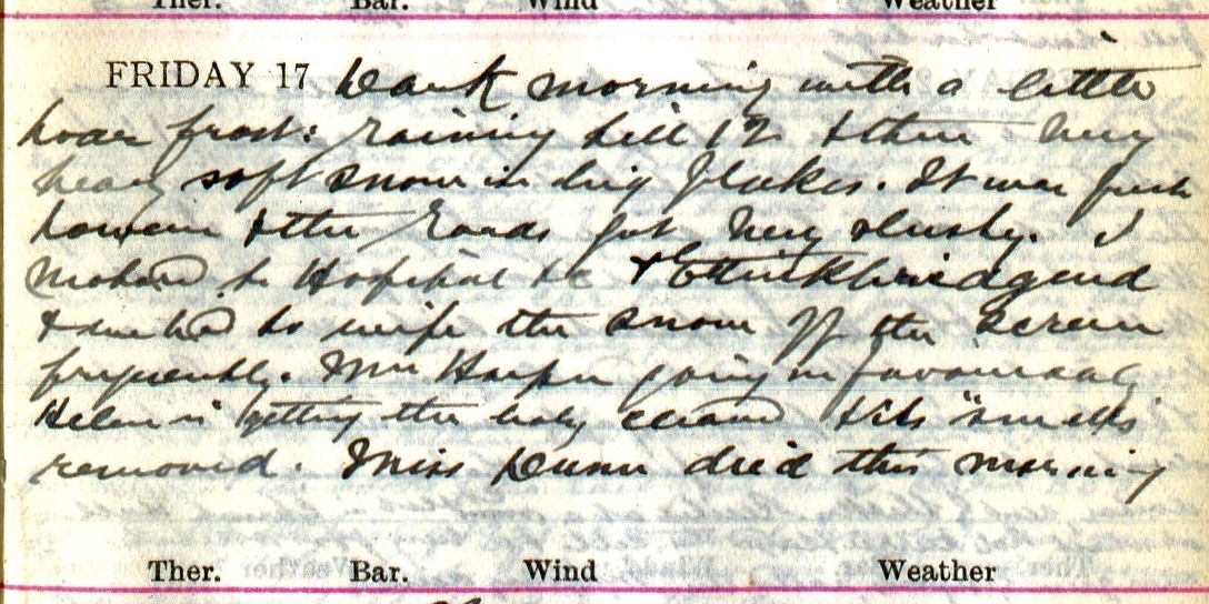 Dark morning with a little hoar frost: raining till 12 + then very heavy soft snow in big flakes. It was fresh however + the roads got very slushy. I motored to Hospital +c + Ettrickbridgend + we had to wipe the snow off the screen frequently. Mrs Harper1 going on favourably. Helen2 is getting the baby cleaned + its smells removed3. Miss Dunn4 died this morning.