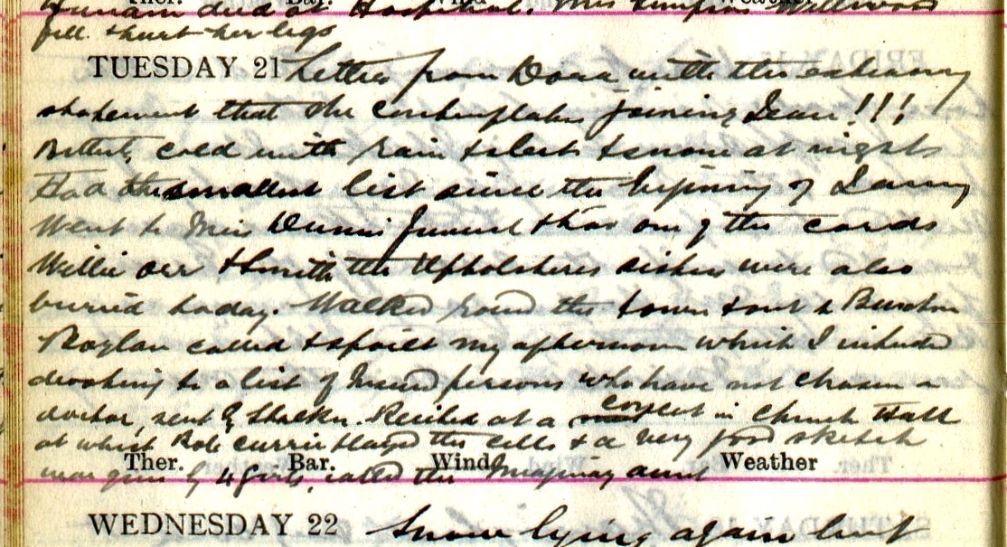 Letter from Dora1 with the [illegible] statement that she contemplates joining Jean!!!2 Bitterly cold with rain + sleet + snow at night. Had the smallest list since the beginning of January. Went to Miss Dunn’s funeral3 + had one of the cords. Willie Orr4 + Smith the upholsterer’s sister5 were also buried today. Walked round the town + out to Buxton6. Boylan7 called called + spoilt my afternoon which I intended devoting to a list of insured persons who have not chosen a doctor, sent by Stalker8. Recited at a concert in Church Hall at which Rob. Currie9 played the cello + a very good sketch was given by 4 girls, called the Imaginary Aunt10.