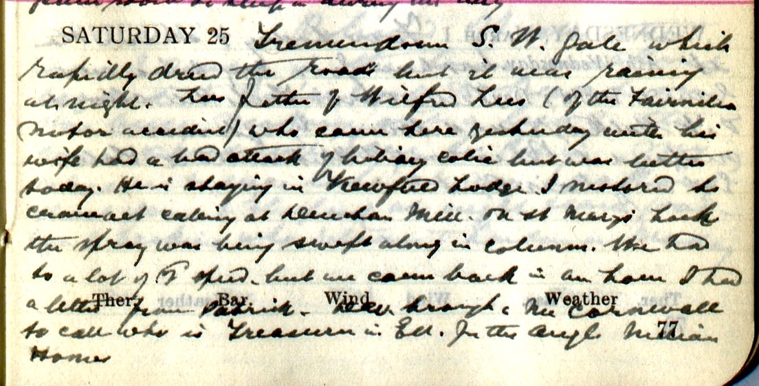 Tremendous S.W. gale which rapidly dried the roads but it was raining at night. The father1 of Wilfred Lees (of the Fairnilea motor accident2) who came here yesterday with his wife had a bad attack of biliary colic3 but was better today. He is staying in Viewfield Lodge. I motored to Cramalt, eating at Deuchar Mill. On St Mary’s Loch the spray was being swept along in columns. We had to [use] a lot of 2nd speed4, but we came back in an hour. I had a letter from Patrick5. Dav.6 brought Mr Cornwall7 to call who is Treasurer in Ed. for the Anglo Indian Homes8.