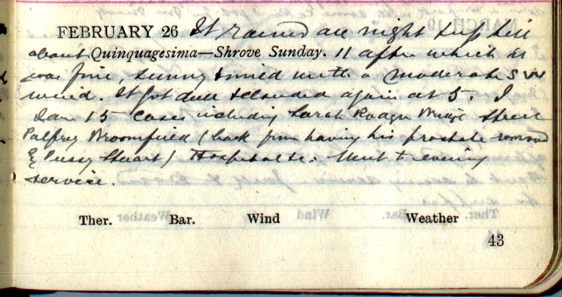 It rained all night + up till about 11 after which it was fine, sunny + mild with a moderate S.W. wind. It got dull + clouded again at 5. I saw 15 cases including Sarah Rodger1, Bridge Street, Palfrey2, Broomfield (back from having his prostate removed by Pussy Stewart3), Hospital +c. Went to evening service.