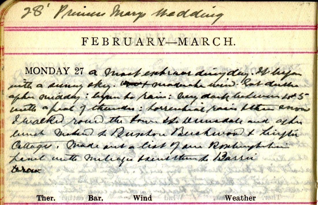 A most extraordinary day. It began with a sunny sky. [Word deleted] + moderate wind. Got duller after midday: began to rain: very dark between 4 + 5 with a peal of thunder: torrential rain + then snow. I walked round the town + to Dunsdale and after lunch motored to Buxton, Beechwood + Linglie Cottages. Made out a list of our Roxburghshire panel with mileages2 + sent them to Barrie3 [word deleted].