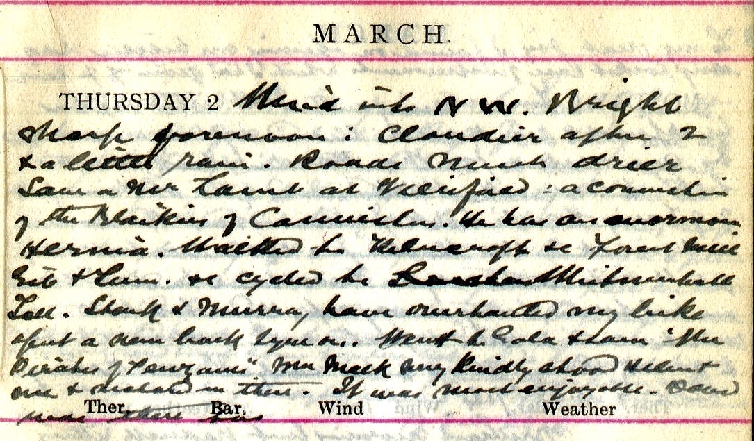 Wind into N.W. Bright sharp forenoon: cloudier after 2 + a little rain. Roads much drier. Saw a Mr Lamb1 at Viewfield2: a connection of the Blaikies of Comiston3. He has an enormous Hernia. Walked to Kilncroft +c Forest Mill, Gib. + Lum.4 +c cycled to word deleted Whitmuirhall Toll5. Stark & Murray6 have overhauled my bike + put a new back tyre on. Went to Gala + saw ‘The Pirates of Penzance’7. Mrs Mack8 kindly stood Helen9 + me + motored us there. It was most enjoyable. David10 was there too.