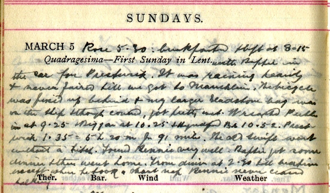 Rose 5.30: breakfasted + left at 8.15 with Baptie1 in the car for Prestwick2. It was raining heavily + never faired till we got to Mauchline3. The bicycle was fixed up behind + my larger Gladstone bag was on the step+ though covered, got pretty wet. We reached Peebles in at 9.25 + Biggar at 10.25 + Hyndford by 10.52. Prestwick 1.35 = 5 h 20 m for 91 miles. The old Swift4 went without a hitch. Found Rennie5 very well. Baptie got some dinner + then went home. From dinner at 2.30 till teatime, except when he took a short nap, Rennie never ceased talking6.