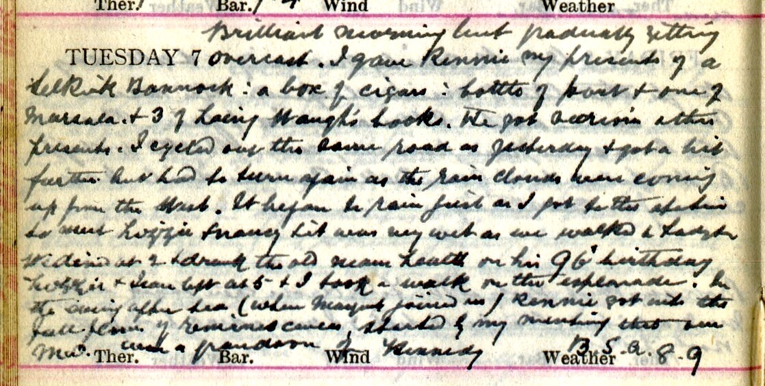 Brilliant morning but gradually getting overcast. I gave Rennie1 my presents of a Selkirk Bannock: a box of cigars: bottle of port + one of Massala + 3 of Laing Waugh’s books2. He got … other presents. I cycled out the same road as yesterday3 + got a bit further but had to turn again as the rain clouds were coming up from the West. It began to rain just as I got to the station to meet Lizzie4 + Nancy5 + it was very wet as we walked to Ladyton6. We dined at 2 + drank the old man’s health on his 96th birthday. Lizzie + Jean7 left at 5 + I took a walk on the esplanade. In the evening after tea (when Margaret8 joined us) Rennie got into the full flow of reminiscences started by my mentioning that new M.O. was a grandson of Kennedy9. B.S.A. 8.910.