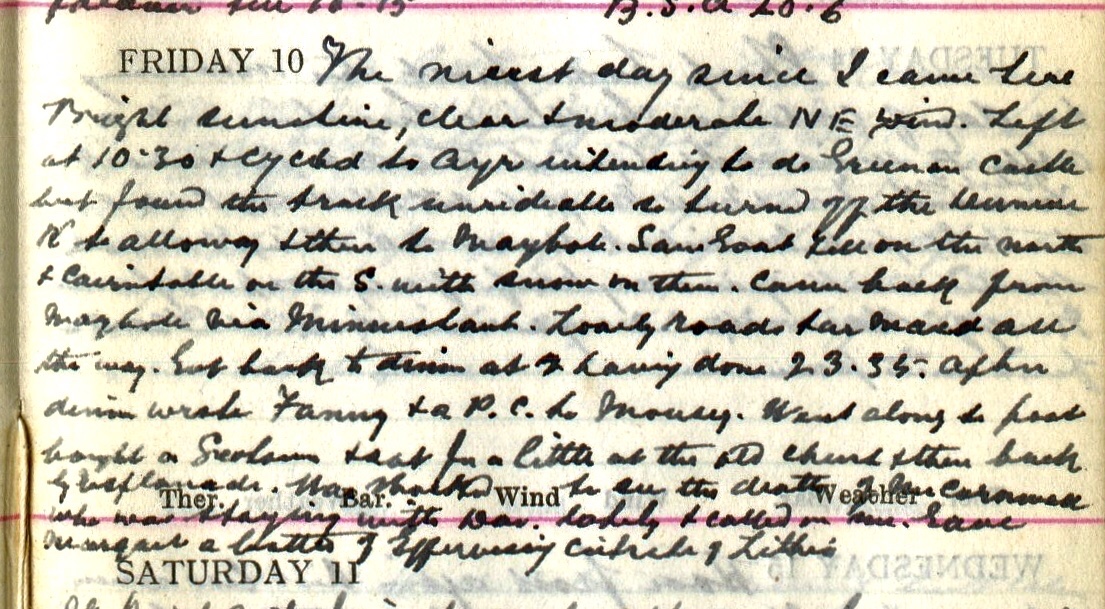 The nicest day since I came here. Bright sunshine, clear + moderate .E. wind. Left at 10.30 + cycled to Ayr intending to do Greenan Castle1 but found the track unrideable so turned off the Dunure Road to Alloway + then to Maybole2. Saw Goat Fell3 on the north + Cairntable4 on the E. with snow on them. Came back from Maybole via Minnishant [sic]5. Lovely roads tarmac’d all the way. Got back to dinner at 2 having done 23.35. After dinner wrote Fanny6 + a P.C. [post card] to Mousey7. Went along to post, bought a Scotsman + sat for a little at the old church + then back by Esplanade. Was shocked to see the death of Mr Cornwall8 who was staying with Dav. lately + called on me9. Gave Margaret10 a bottle of Effervescing Citrate of Lithia11.