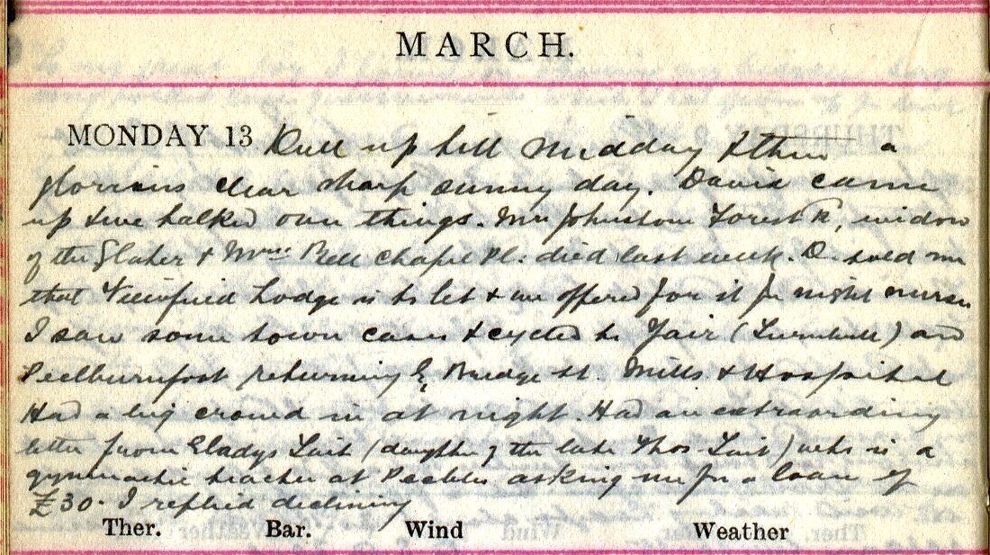 Dull up till midday + then a glorious clear sharp sunny day. David1 came up + we talked over things. Mrs Johnstone2, Forest Road, widow of the Slater + Mrs Bell3, Chapel Place: died last week. D. told me that Viewfield Lodge is to let + we offered for it for night nurses. I saw some town cases + cycled to Yair (Turnbull) + Peelburnfoot returning by Bridge St. Mills + Hospital. Had a big crowd in at night. Had an extraordinary letter from Gladys Tait4 (daughter of the late Thomas Tait) who is a gymnastics teacher at Peebles asking for a loan of £30. I replied declining.