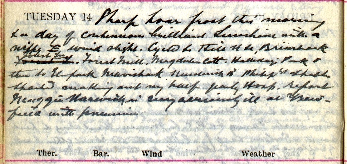 Sharp hoar frost this morning + a day of continuous brilliant sunshine with a nippy E. wind slight. Cycled to Hill Street +c, Briarbank, Forest Terrace, Forest Mill, Magdalen Cottage, Halliday’s Park + then to Elmpark, Mavisbank, … [and] Philiphaugh Stables. Started making out my half yearly Hospital report. Maggie Warwick1 is seriously ill at Viewfield with pneumonia.