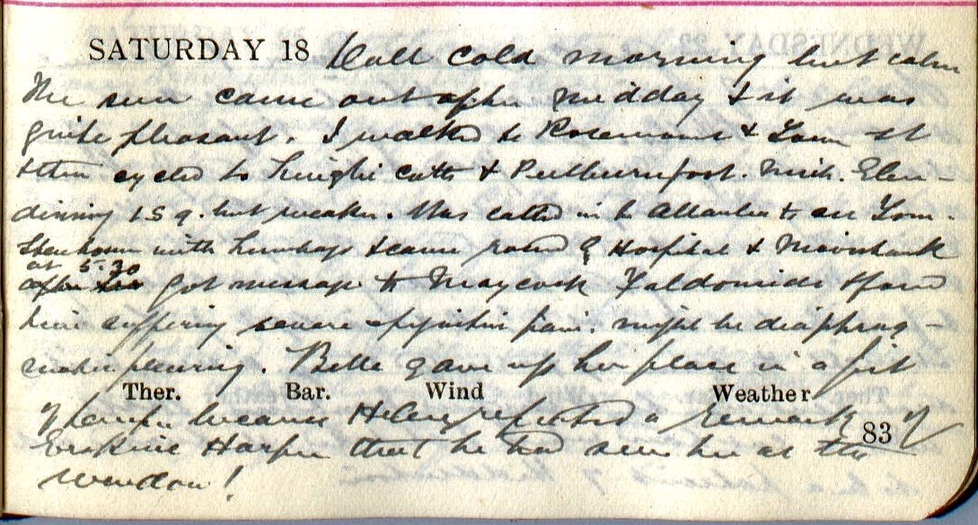 Dull cold morning but calm. The sun came out after midday + it was quite pleasant. I walked to Rosemount1 + Tower Street + then cycled to Linglie Cottages2 + Peelburnfoot. Mich. Glendinning3 i.s.q.4 but weaker. Was called in to Allanlea to see Tom Stenhouse5 with lumbago + came round by Hospital + Mavisbank. At 5.30 got message to Maycock6, Faldonside + found him suffering severe [illegible word] pain: might be diaphragmatic pleurisy. Bella7 gave up her place in a fit of temper because Helen8 reported a remark of Erskine Harper9 that he had seen her at the window!10