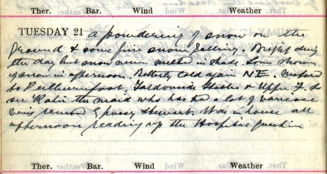 A powdering of snow on the ground + some fine snow falling. Bright during the day but the snow never melted in shade. Some showers of snow in afternoon. Bitterly cold again N.E. Motored to Peelburnfoot, Faldonside Stables + Upper F. to see Katie1 the maid who has had a lot of varicose veins removed by Pussy Stewart2. Was in house all afternoon reading up the Hospital question.