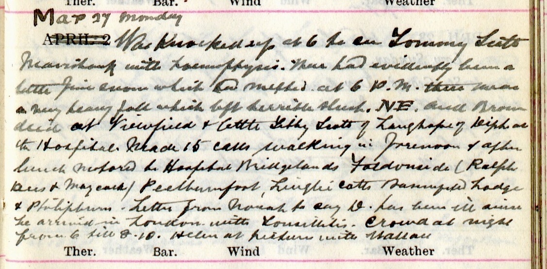 Was knocked up at 6 to see Tommy Scott1, Mavisbank with Haemoptysis2. There had evidently been a little fine snow which had melted. At 6 p.m. there was a heavy fall which left terrible slush. N.E. [wind] And. Brown3 died at Viewfield + little Tibby Scott4 of Langhope of Diph. at the Hospital. Made 15 calls walking in forenoon + after lunch motored to Hospital, Bridgelands, Faldonside (Ralph Dees5 + Maycock6), Peelburnfoot, Linglie Cottages, Bannerfield Lodge7 + Philipburn. Letter from Norah8 to say D. has been ill since he arrived in London with Tonsillitis. Crowd at night from 6 till 8.10. Helen9 at Pictures with Wallace10.
