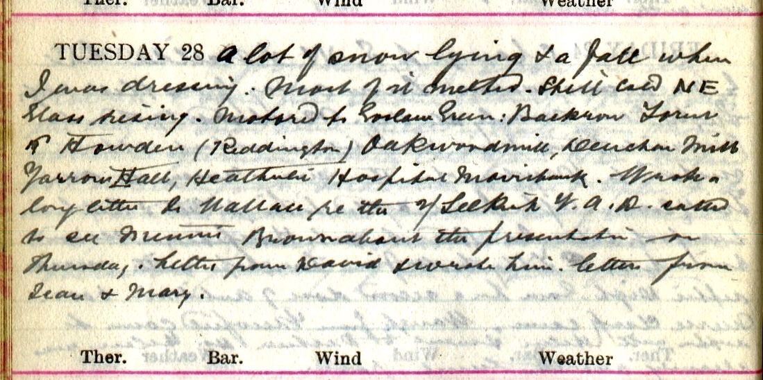 A lot of snow lying + a fall when I was dressing: most of it melted. Still cold N.E. Glass rising. Motored to Goslaw Green: Backrow, Forest Road, Howden (Reddington1), Oakwoodmill, Deuchar Mill, Yarrow Hall, Heatherlie, Hospital [and] Mavisbank. Wrote long letter to Wallace re the 2/Selkirk V.A.D.2 Called to see Minnie Brown3 about the presentation on Thursday. Letter from David 4 + wrote him. Letters from Jean5 + Mary6.