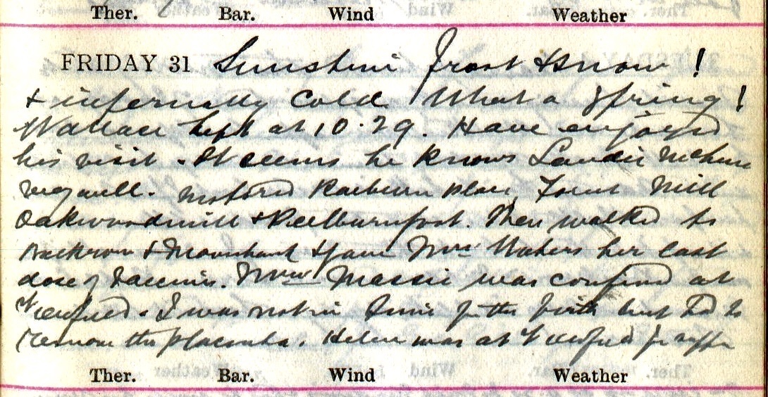 Sunshine frost + snow! + infernally cold. What a Spring! Wallace1 left at 10.29. Have enjoyed his visit. It seems he knows Sandie McClure2 very well. Motored Raeburn Place, Forest Mill, Oakwoodmill + Peelburnfoot. Then walked to Backrow + Mavisbank + gave Mrs Waters3 her last dose of vaccine. Mrs Massie4 was confined at Viewfield. I was not in time for the birth but had to remove the placenta. Helen5 was at Viewfield for supper.