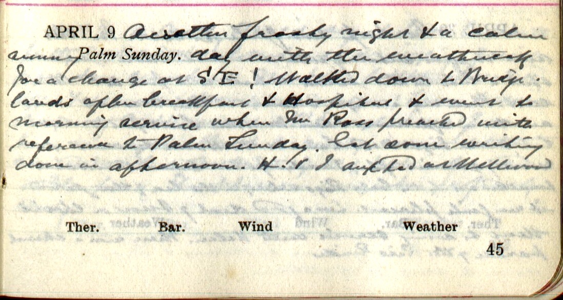 Another frosty night + a calm sunny day with the weathercock for a change at S.E! Walked down to Bridgelands1 after breakfast + Hospital + went to morning service where Mr Ross2 preached with reference to Palm Sunday. Got some writing done in afternoon. H.3 + I supped at Wellwood4.