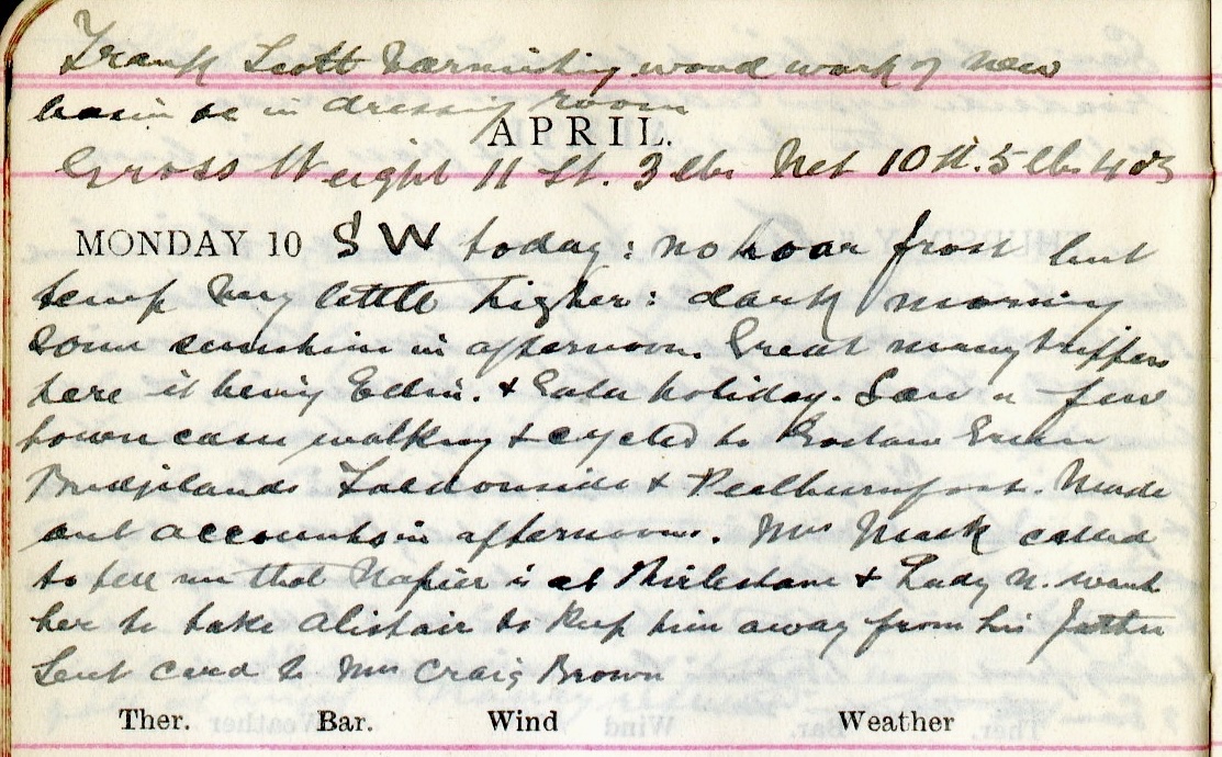 S.W. [wind] today: no hoar frost but temp. very little higher: dark morning some sunshine in afternoon. Great many trippers here it being Edin. + Gala. holiday. Saw a few town cases walking + cycled to Goslaw Green, Bridgelands, Faldonside + Peelburnfoot. Wrote out accounts in afternoon. Mrs Mack1 called here to tell me that Napier2 is at Thirlestane3 + Lady N.4 wants her to take Alistair5 to keep him away from his father. Sent card to Mrs Craig Brown6.