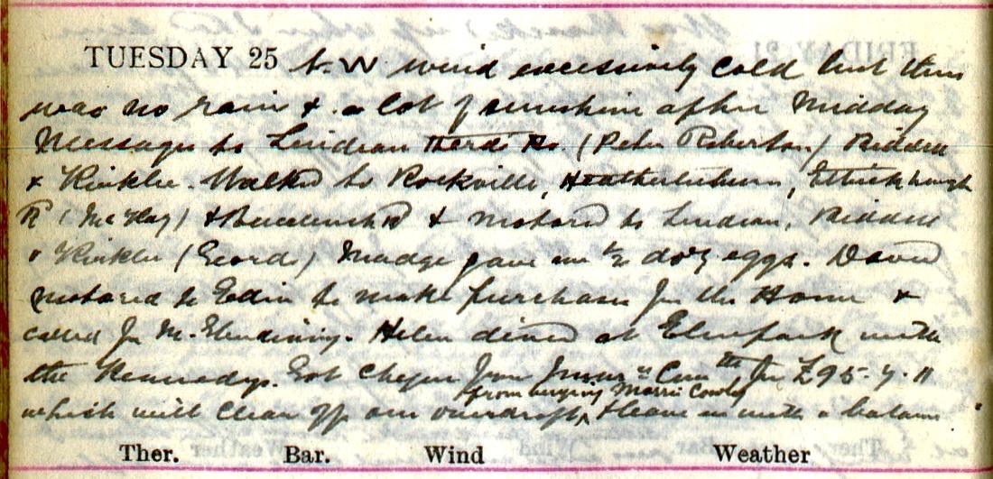 N.W. wind exceedingly cold but there was no rain + a lot of sunshine after midday. Messages to Lindean Herd’s Ho. (Peter Robertson1), Riddell + Kirklea2. Walked to Rockville3, Heatherlieburn, Ettrickhaugh Road (McKay4) + Buccleuch Road + motored to Lindean, Kirklea (Geordo5) Madge gave me ½ doz. eggs. David6 motored to Edin. to make purchases for the Home + called for M Glendinning7. Helen8 dined at Elmpark9 with the Kennedys10. Got cheque from Insurce Comttee for £95 7 11 which will clear off our overdraft from buying Morris Cowley11 + leave us with a balance.
