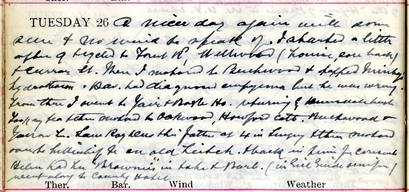 A nicer day again with some sun + no wind to speak of. I started a little after 9 + cycled to Forest Road, Wellwood (Louisa1, sore back) + Curror Street. Then I motored to Beechwood2 + stopped Minty’s3 hydra[…]. Dav.4 had diagnosed empyema but he was wrong.5 From there I went to Yair + Bogle House, returning by Beechwood + Yarrow Terrace. Saw Roy Dees + his father6 at 4 in surgery + then motored over to Lilliesleaf to see old Leitch7 + back in time for concert. Helen8 had her “Brownies” in9 + she + Barb.10 (in Girl Guides uniform) went along to County Hotel.