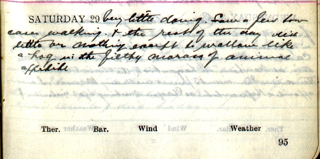 Very little doing. Saw a few town cases walking + the rest of the day did little or nothing except to wallow like a hog in the filthy morass of animal appetite.