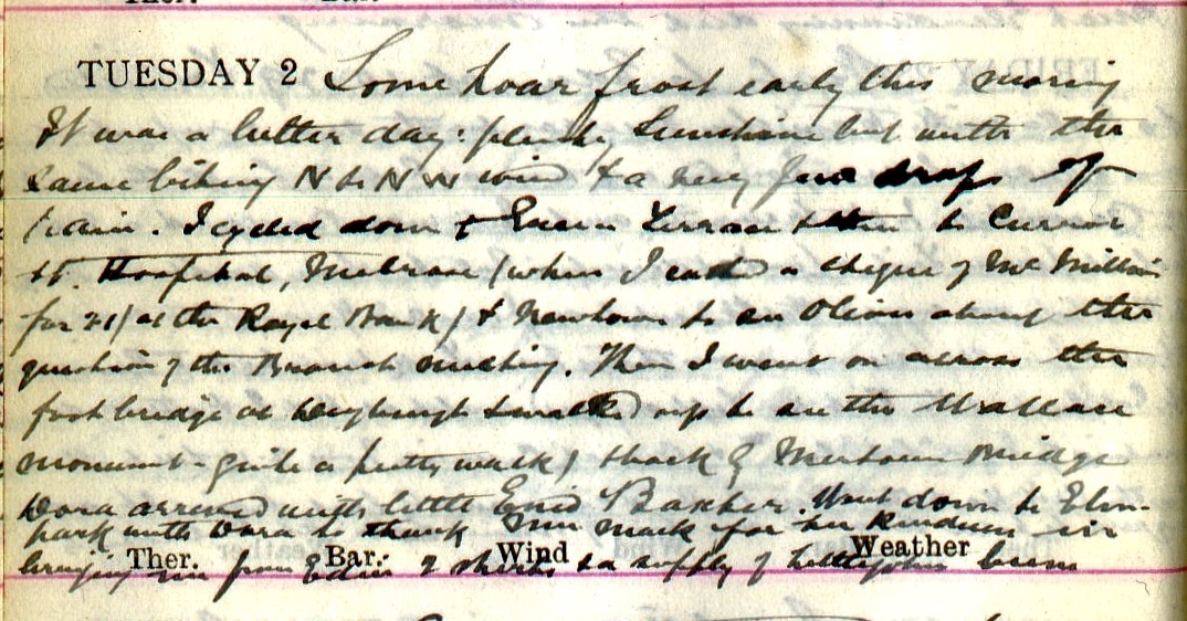 Some hoar frost early this morning. It was a better day: plenty sunshine but with the same biting N. + N.W. wind + a very few drops of rain. I cycled down to Green Terrace + then to Curror Street, Hospital, Melrose (where I cashed a cheque of McMillan’s1 for 21/- at the Royal Bank) + Newtown to see Oliver2 about the question of the Branch meeting3. Then I went across the foot bridge to Dryburgh + walked up to see the Wallace Monument4 – quite a pretty walk) + back by Mertoun Bridge. Dora5 arrived with little Enid Barker6. Went down to Elmpark7 with Dora to thank Mrs Mack for her kindness in bringing me from Edin. 2 shirts + a supply of Littlejohn’s beans8.
