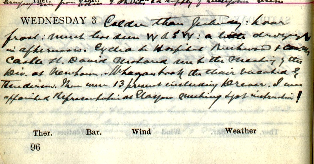 Colder than yesterday: hoar frost: much less sun W. to S.W. : a little drizzle in afternoon. Cycled to Hospital, Beechwood + [word deleted] Castle Street. David1 motored me to the meeting of the Div. at Newtown2. McLagan3 took the chair vacated by Henderson4. There were 13 present including Drever5. I was appointed Representative at Glasgow Meeting6 + got instructions!