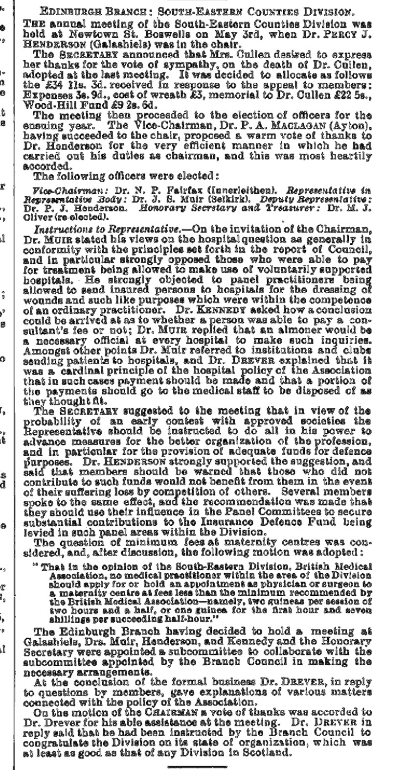 4 Assume Percy James Henderson (1871-1935), M.B., medical practitioner at Church Street, Galashiels; had chaired the 16 November 1921 meeting, see Dr Muir’s diary entry for that date