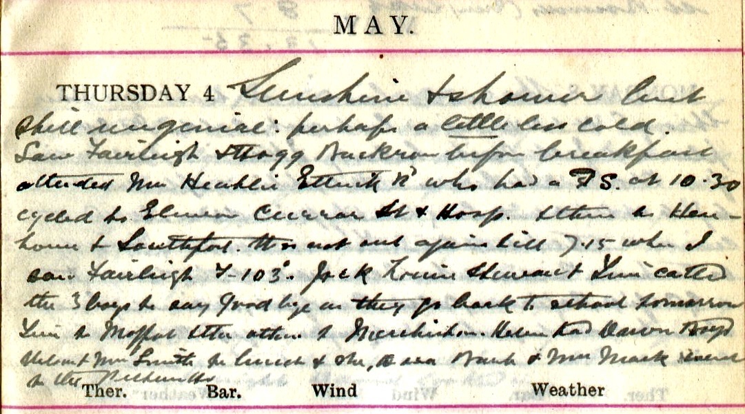 Sunshine + showers but still ungenial [sic]: perhaps a little less cold. Saw Fairleigh1 + Hogg2, Backrow before breakfast [and] attended Mrs Heatlie3, Ettrick Road who had a F.S. [?] at 10.30. Cycled to Elmrow, Curror Street + Hospital + then to Henhouse + Southport. Was not out again till 7.15 when I saw Fairleigh T.105. Jock, Louise, Stewart + Tim4 called, the 3 boys to say goodbye as they go back to school tomorrow, Tim to Moffat5 + the others to Merchiston. Helen6 had Dawn Boyd Milne7 + Mrs Smith8 to lunch + she, Dora9, Norah10 [?] + Mrs Mack11 went to the Picture House.