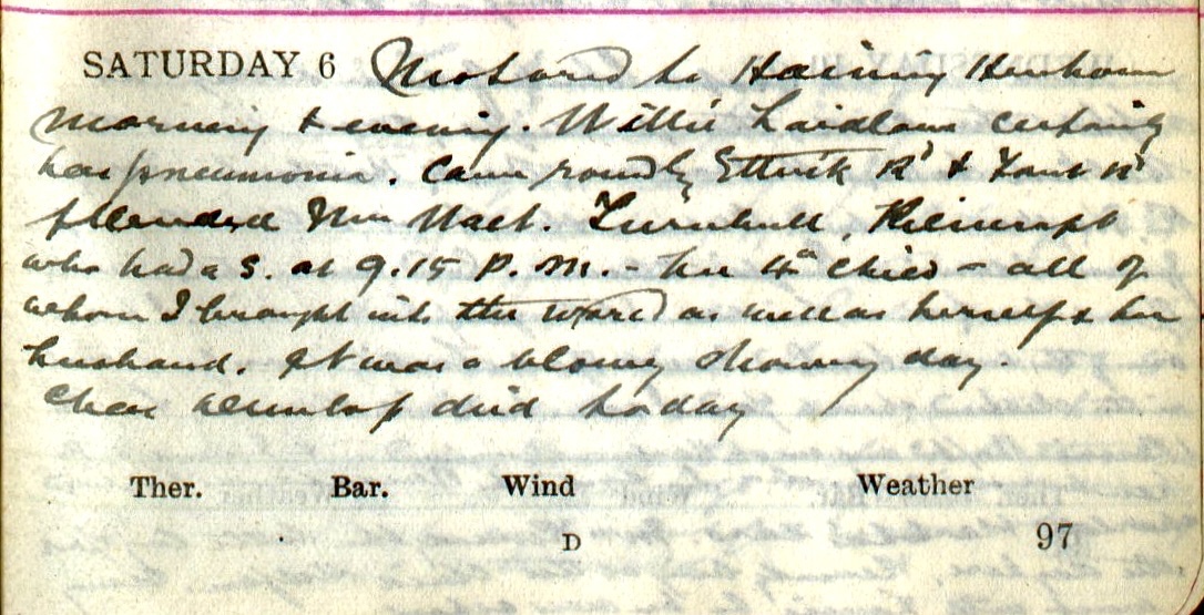 Motored to Haining Henhouse morning + evening. Willie Laidlaw1 certainly has pneumonia. Came round by Ettrick Road + Forest Road + attended [?] Mrs Walt. Turnbull2, Kilncroft who had a S. [son] at 9.15 p.m.3 – her 4th child – all of whom I brought into this world as well as herself + her husband4 . It was a blowy, showery day. Chas. Dunlop died today5.
