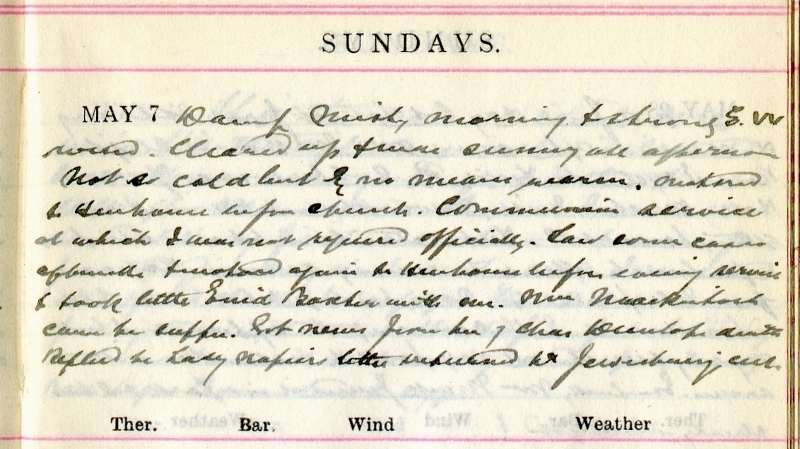 Damp misty morning + strong S.W. wind. Cleared up + was sunny all afternoon. Not so cold but by no means warm. Motored to Henhouse1 before church. Communion service at which I was not required officially. Saw some cases afterwards + motored again to Henhouse before evening service + took little Enid Baxter2 with me. Mrs Mackintosh3 came to supper. Got news from her of Chas. Dunlop’s death4. Replied to Lady Napier’s5 letter + returned Dr [two illegible words]6.