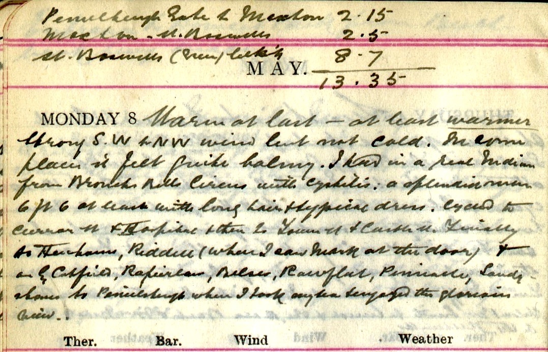 Warm at last – at least warmer Strong S.W. + N.W. wind but not cold. In some places it felt quite balmy. I had in a real Indian from Broncho Bill’s Circus2 with Cystitis. a splendid man 6ft 6 at least with long hair + typical dress. Cycled to Curror Street, Hospital + then to Tower Street + Castle Street. Finally to Henhouse3, Riddell (where I saw Mark4 at the door) + on by Cotfield, Rapierlaw [sic], Belses, Rawflat, Pinnacle, Sandystones to Penielheugh5 where I took my tea + enjoyed the glorious view.
