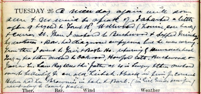 A nicer day again with some sun + no wind to speak of. I started a little after 9 + cycled to Forest Road, Wellwood (Louisa1, sore back) + Curror Street. Then I motored to Beechwood2 + stopped Minty’s3 hydra[…]. Dav.4 had diagnosed emphysema but he was wrong. From there I went to Yair + Bogle House, returning by Beechwood + Yarrow Terrace. Saw Roy Dees + his father5 at 4 in surgery + then motored over to Lilliesleaf to see old Leitch6 + back in time for concert. Helen7 had her “Brownies” in + she + Barb.8 (in Girl Guides uniform) went along to County Hotel.