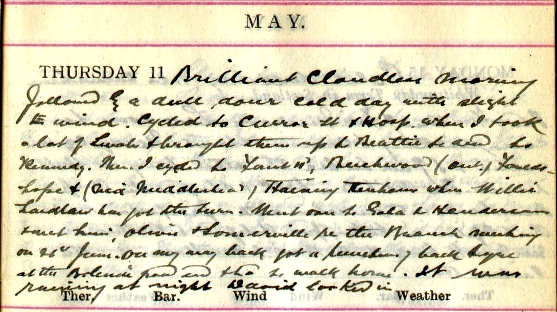 Brilliant cloudless morning followed by a dull, dour cold day with slight E. wind. Cycled to Curror Street + Hospital where I took a lot of swabs1 + brought them up to Beattie2 to send to Kennedy3. Then I cycled to Forest Road, Beechwood (out), Fauldshope + (via Middlestead), Haining, Henhouse where Willie Laidlaw4 has got the turn. Went over to Gala to Henderson5 + met him, Oliver6 + Somerville7 re the Branch meeting on the 26th June. On my way back got a puncture of back tyre at the Boleside road end + had to walk home. It was raining at night. David8 looked in9.