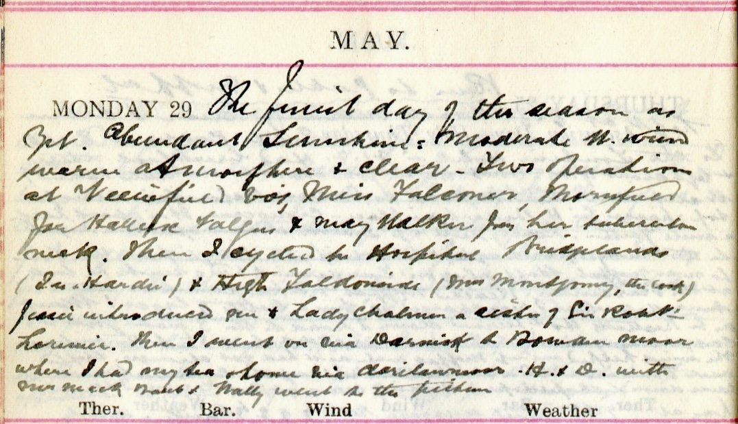 The finest day of the season as yet. Abundant sunshine: moderate W. wind, warm atmosphere + clear. Two operations at Viewfield viz. Miss Falconer1, [illegible] for Hallux Valgus + May Walker2 for her tuberculous neck. Then I cycled to Hospital, Bridgelands (Jas. Hardie3) + High Faldonside (Mrs Montgomery the cook4). Jessie5 introduced me to Lady Chalmers6 a sister of Sir Robert Lorimer7. Then I went on via Darnick to Bowden Moor where I had my tea + home via Clarilawmoor. H. + D.8 with Mrs Mack9, Barb10 + Wally11 went to the pictures.