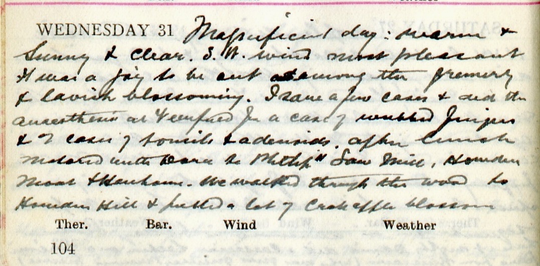 Magnificent day: warm + sunny + clear. S.W. wind most pleasant. It was a joy to be out among the greenery + lavish blossoming. I saw a few town cases + did the anaesthesia at Viewfield for a case of webbed [?] fingers + 2 cases of tonsils + adenoids. After lunch motored with Dora1 to Philiphaugh Saw Mill, Howden Moat2 + Henhouse. We walked through the wood to Howden Hill + pulled a lot of crab apple blossom.