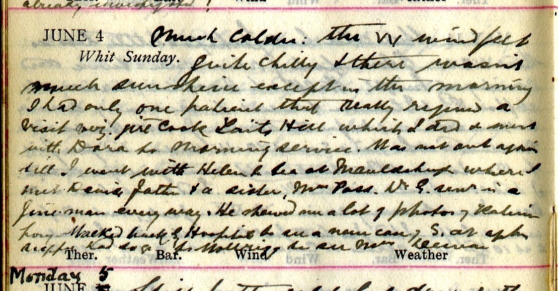 Much colder: the W. wind felt quite chilly + there wasn’t much sunshine except in the morning. I had only one patient that really required a visit viz. girl Cook, Tait’s Hill1 which I did + went with Dora2 to Morning Service. Was not out again till I went with Helen3 to tea at Mauldsheugh4 where I met David’s5 father6 + a sister, Mrs Pass7. Dr G. senr is a fine man every way. He showed me a lot of photos of Kalimpong8. Walked back by Hospital to see a new case of S. xx After supper had to go to Wollrigg to see Mrs Dewar9.