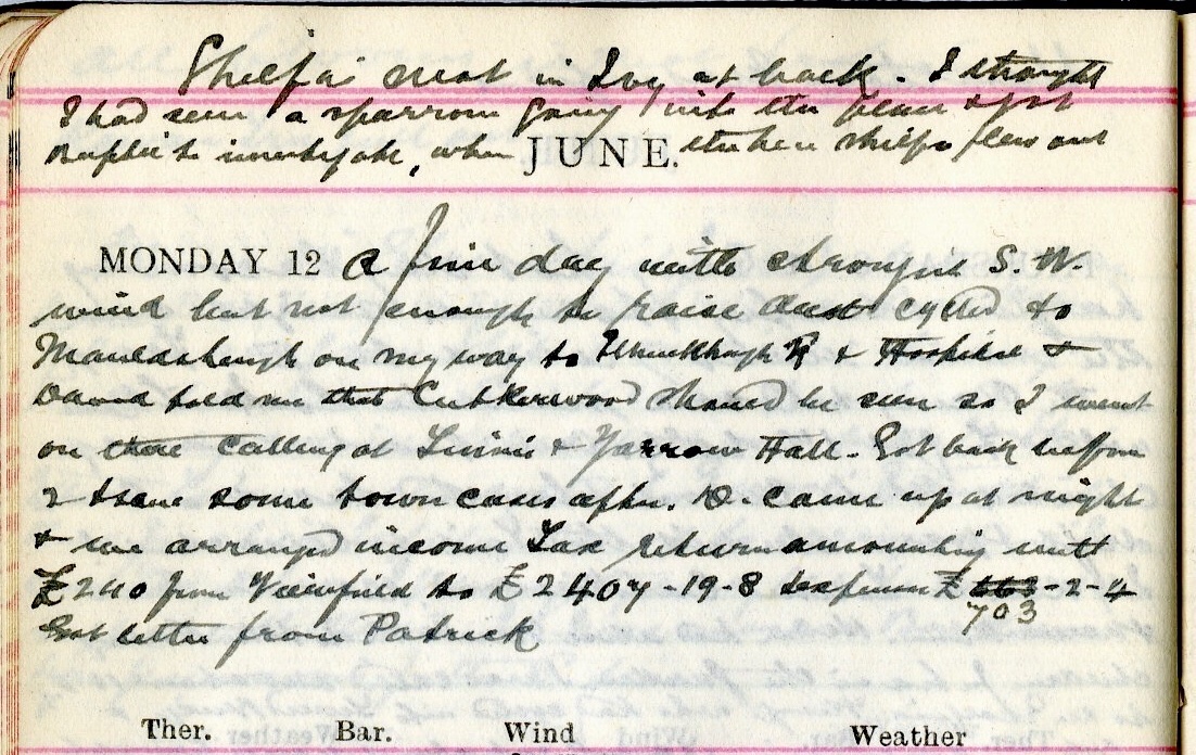 A fine day with strongish S.W. wind but not enough to raise dust. Cycled to Mauldsheugh on my way to Ettrickhaugh Road + Hospital + David3 told me that Cutkerwood should be seen so I went on there calling at Tinnis + Yarrow Hall4. Got back before 2 + saw some town cases after. D.3 came up at night + we arranged Income Tax returns amounting … £240 from Viewfield to £2407-19-8 [illegible] £663 703-2-45. Got letter from Patrick6.