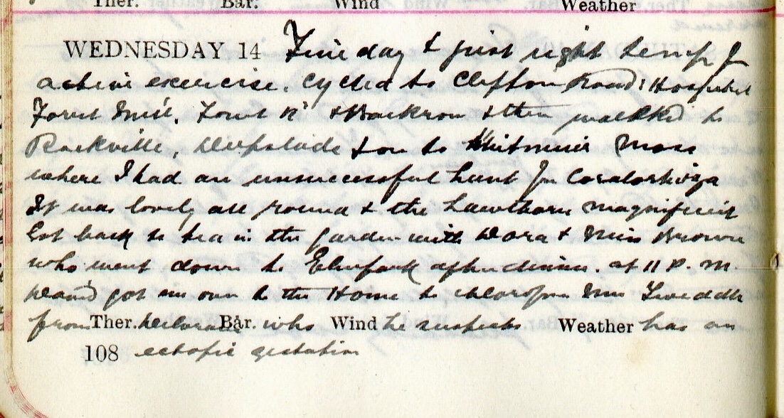 Fine day + just right temp. for active exercise. Cycled to Clifton Road, Hospital, Forest Mill, Forest Road + Backrow + then walked to Rockville, Deepslade [sic] + on to Whitmuir moss where I had an unsuccessful hunt for Coralorhiza1. It was lovely all round + the hawthorn magnificent. Got back to tea in the garden with Dora2 + Miss Brown3 who went down to Elmpark4 after dinner. At 11 p.m. David5 got me over to the Home to Chloroform Mrs Tweddle from Deloraine6 who he thinks has an ectopic gestation.