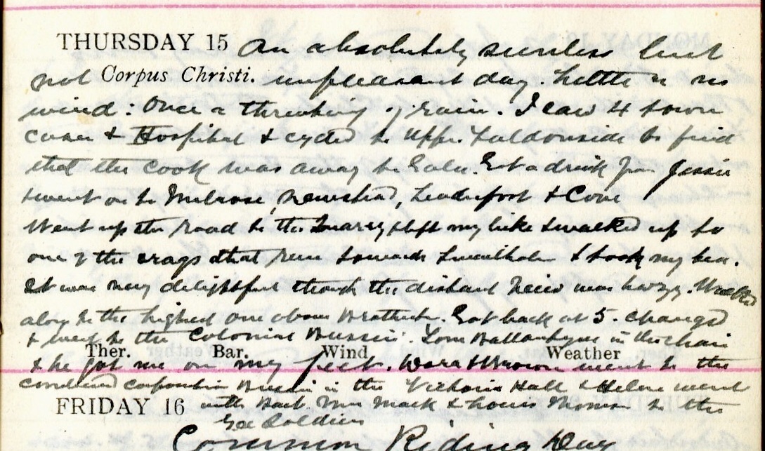 An absolutely sunless but not unpleasant day. Little or no wind: once a threatening of rain. I saw 4 town cases + Hospital + cycled to Upper Faldonside to find that the cook1 was away to Gala. Got a drink from Jessie2 + went on to Melrose, Newstead, Leaderfoot + Cove3. Went up the road to the quarry + left my bike + walked up one of the crags that run towards Smailholm + took my tea. It was very delightful though the distant views were hazy. Walked along to the highest one above Brotherston. Got back at 5. Changed + went to the Colonial Bussin’.4 Tom Ballantyne5 in the Chair + he got me on my feet. Dora6 + Brown7 went to [illegible] Corporation Bussin’ in the Victoria Hall + Helen8 went with Barb.,9 Mrs Mack10 + Louis Thomson11 to the [illegible] soldiers.12