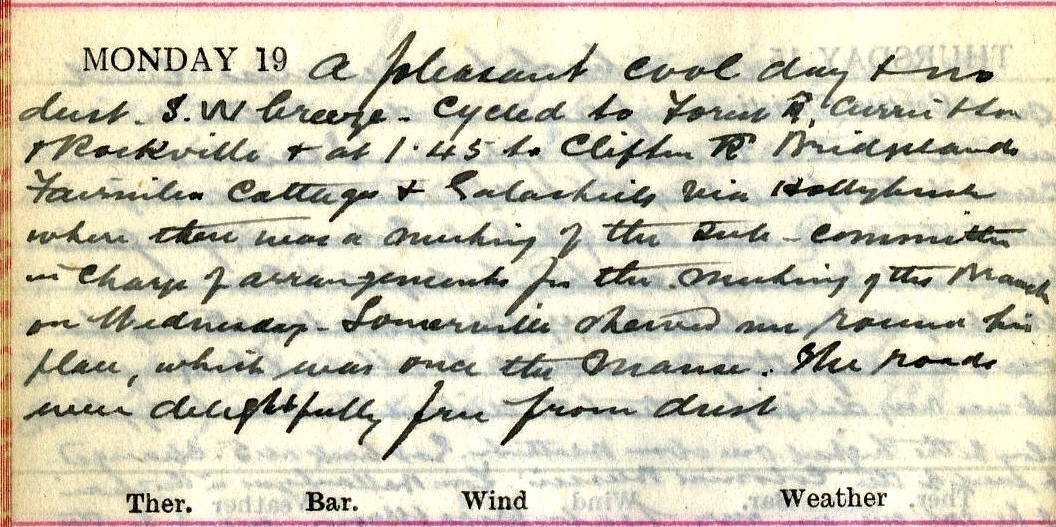 A pleasant cool day + no dust. S.W. breeze. Cycled to Forest Road, Currie [illegible] + Rockville1 + at 1.45 to Clifton Road, Bridgelands, Fairnilea Cottages + Galashiels via Hollybush2 where there was a meeting of the sub-committee in charge of arrangements for the meeting of the Branch3 on Wednesday. Somerville4 showed me round his place, which was once the Manse5. The roads were delightfully free from dust.