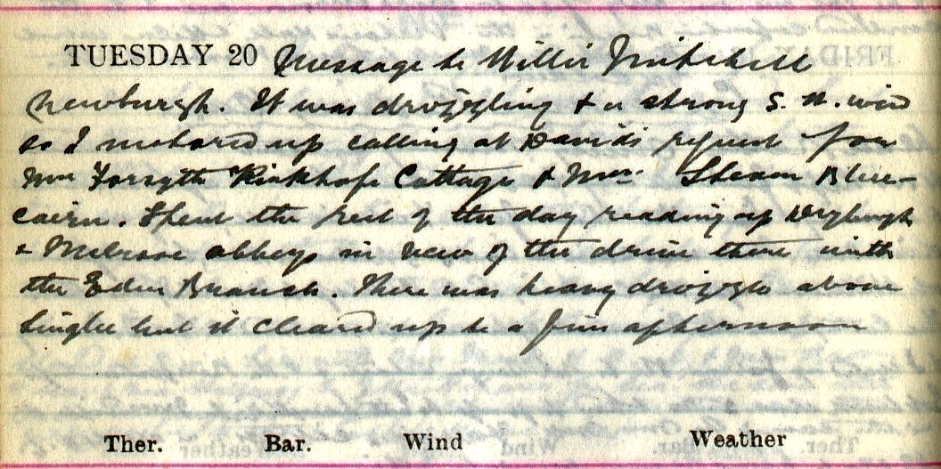 Message to Willie Mitchell1, Newburgh. It was drizzling + a strong S.W. wind so I motored up calling at David’s2 request for Mrs Forsyth, Kirkhope Cottage3 + Mrs Steven [sic], Bluecairn4. Spent the rest of the day reading up Dryburgh + Melrose Abbeys in view of the drive there with the Edinburgh Branch5. There was heavy drizzle above Singlie but it cleared up to a fine afternoon.