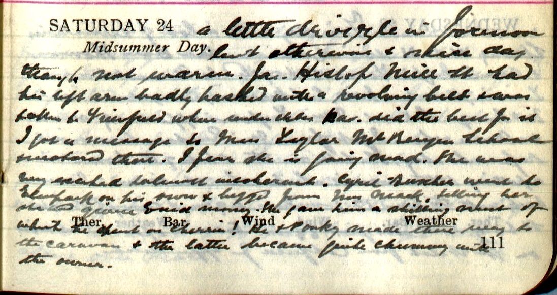 A little drizzle in forenoon but otherwise + since dry, though not warm. Jas. Hislop1, Mill Street, had his left arm badly hacked with a revolving belt + was taken to Viewfield where under Chlor[oform] Dav.2 did the best for it. I got a message to Miss Taylor3, Mt Benger School, + motored there. I fear she is going mad. She was very excited + almost incoherent. Cyril Baxter4 went to Elmpark on his own + begged from Mrs Mack5 telling her she had given Enid6 money. She gave him a shilling most of which he spent on cherries! He + Pouky7 made their way to the caravan + the latter became chummy with the owner8.