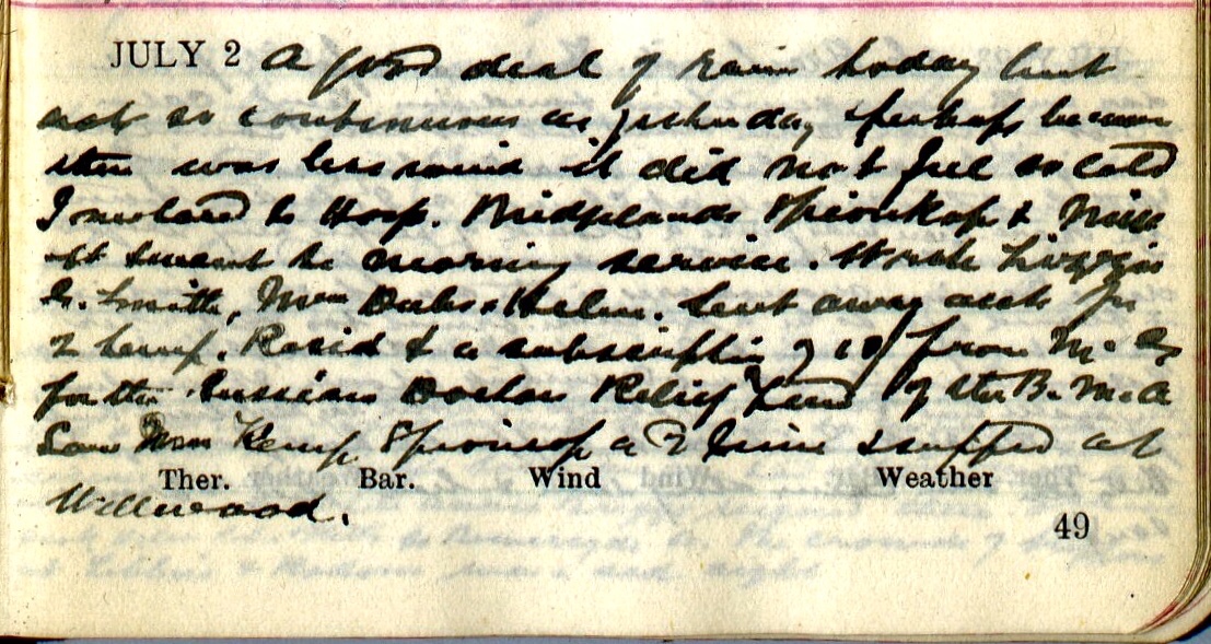 A good deal of rain today but not as continuously yesterday + perhaps because there was less rain it did not feel so cold. I motored to Hosp., Bridgelands, Spionkop + Mill Street + went to morning service. Wrote Lizzie G. Smith1, Mrs Dubs2 + Helen3. Sent away accounts for 2 temp. Resid. + a subscription of 10/- [shillings] from M + G4 for the Russian Doctors Relief Fund of the B.M.A.5. Saw Mrs Kemp, Spionkop6 a 2nd time + supped at Wellwood7.