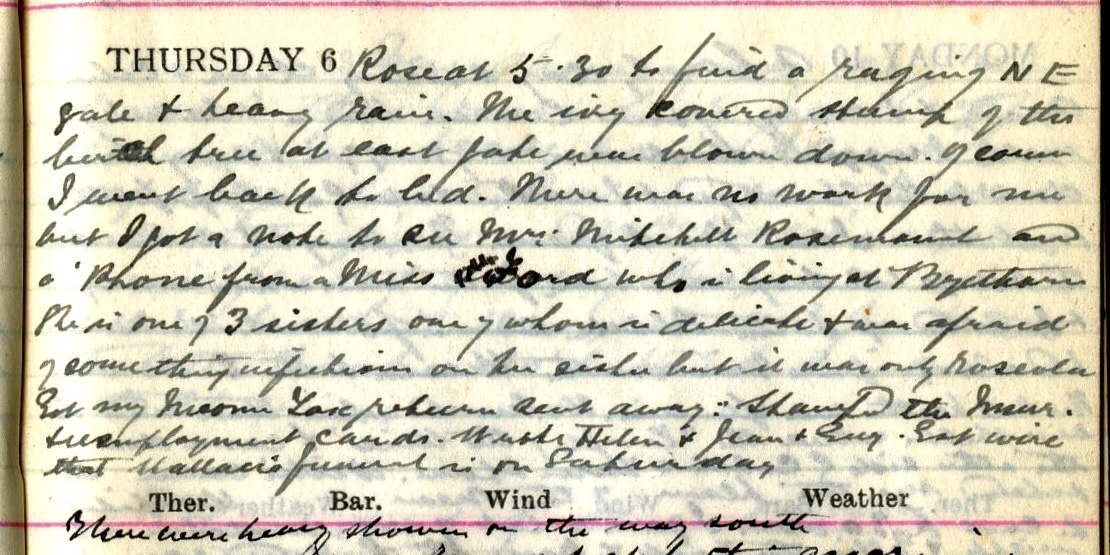 Rose at 5.30 to find a raging N.E. gale + heavy rain. The ivy covered stump of the birch tree at East Gate was blown down. Of course I went back to bed. There was no work for me but I got a note to see Mrs Mitchell, Rosemount1 and a ‘Phone from Miss Ford [?] who is living at Byethorn2. She is one of three sisters one of whom is delicate + was afraid of something infectious on her sister but it was only Roseola. Got my Income Tax return sent away. Stamped the Insur[ance] + unemployment cards. Wrote Helen + Jean3 + Guy4. Got wire that Wallace’s funeral is on Saturday5.