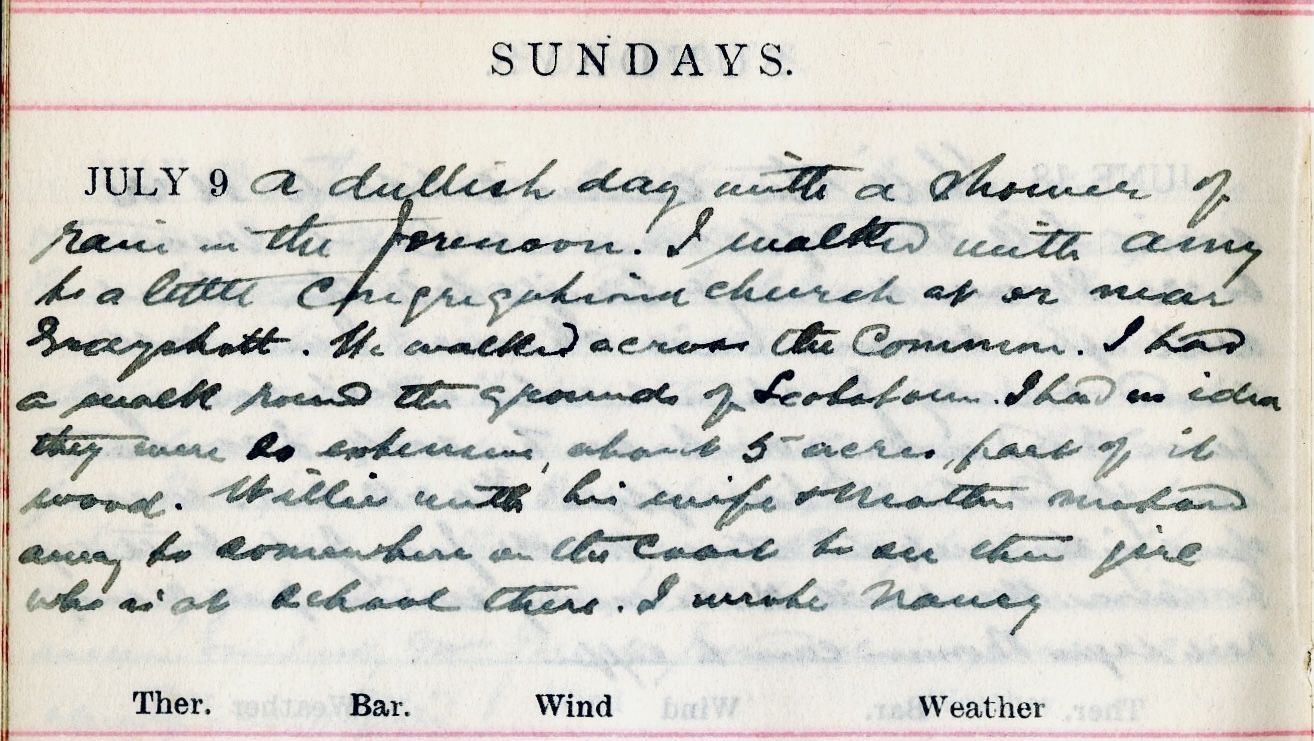 A dullish day with a shower of rain in the forenoon. I walked with Amy1 to a little Congregational Church at or near Grayshott2. We walked across the Common. I had a walk round the grounds of Scotstoun3. I had no idea they were so extensive, about 5 acres, part of it wood. Willie with his wife + mother4 motored away to somewhere on the Coast to see their girl5 who is at school there. I wrote Nancy6.