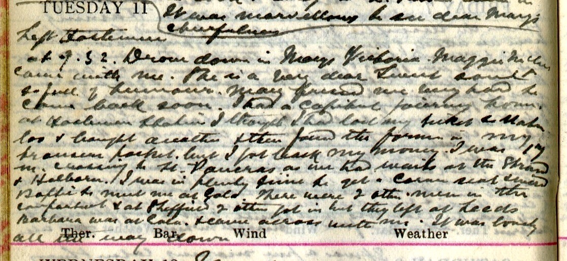 Left Haslemere at 9.32. Drove down in Mary’s Victoria 1. Maggie McLure 2 came with me. She is a very dear sweet soul + so full of humour. Mary 3 pressed me very hard to come back soon. I had a capital journey home. At Haslemere Station I thought I had lost my ticket to Waterloo + brought another + then found the former in my trouser pocket. But I got back my money. I was 17m [minutes] crossing to St Pancras as we had waits at The Strand + Holborn. I was in plenty time to get a corner seat + wired Baptie 4 to meet me at Gala. There were 2 other men in the compartment. + at Sheffield 2 others got in but they left at Leeds. Barbara5 was at Gala. + came across with me. It was lovely all the way down.